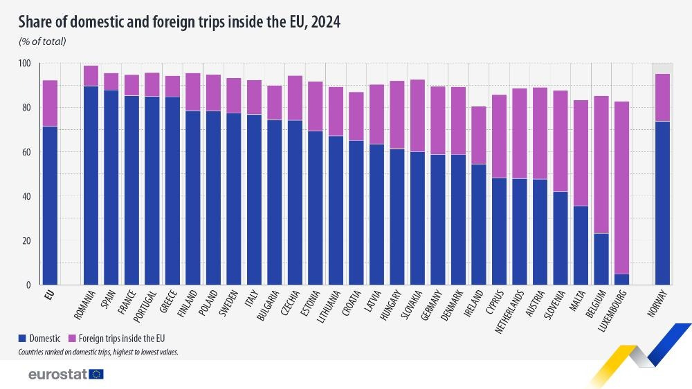 71% of trips taken by EU residents are domestic, while 21% are to other EU countries and the remaining 8% to countries outside of the EU3. To be fair, total expenditure was higher for foreign trips.